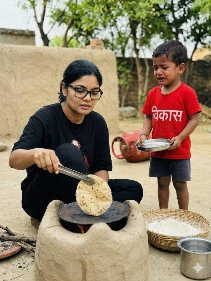 तस्वीर में एक महिला चूल्हे पर रोटी बनाती नजर आ रही है, जबकि पास खड़ा एक छोटा बच्चा, जिसकी टी-शर्ट पर “विकास” लिखा है, रोता हुआ दिख रहा है। बैकग्राउंड में गैस सिलेंडर रखा हुआ है, जिससे पोस्ट का संदेश और स्पष्ट होता है।