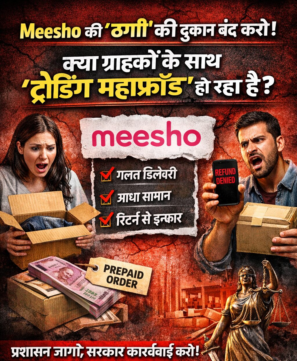 ऑनलाइन शॉपिंग प्लेटफॉर्म मीशो (Meesho) पर अब सिर्फ खराब सर्विस नहीं, बल्कि ग्राहकों के साथ सुनियोजित धोखे के आरोप लगने लगे हैं। गलत डिलीवरी, अधूरी खेप और फिर ‘पॉलिसी’ का बहाना—इन सबने मीशो की ट्रेडिंग और कस्टमर प्रोटेक्शन पर गंभीर सवाल खड़े कर दिए हैं।